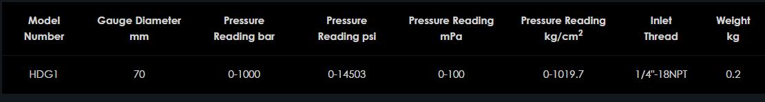 Digitálny tlakomer Hi-Force HDG1 je schopný merať hydraulický tlak až do 1000 barov (14 503 psi) a môže zobrazovať v rôznych merných jednotkách, ktoré zahŕňajú bar, psi, mPa, kg/cm2, ako aj jednu dodatočnú užívateľsky definovanú, programovateľnú jednotku. Toto vysokokvalitné meradlo ponúka presnosť 0,5 % v celom rozsahu a obsahuje laserom zváraný nerezový snímač a objímku, vďaka čomu je vhodný na použitie so širokou škálou kvapalín. Medzi štandardné funkcie patrí aj tara, minimálna a maximálna pamäť, modré podsvietenie displeja, gumené ochranné puzdro a odolnosť voči poveternostným vplyvom IP65.