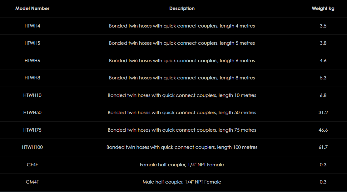 Hydraulické hadice momentového kľúča Hi-Force sú kompatibilné na použitie so všetkými hydraulickými momentovými kľúčmi Hi-Force a momentovými čerpadlami až do maximálneho pracovného tlaku 700 barov. Hadice momentových kľúčov sú dostupné ako spojené dvojité hadice s rýchlospojkami na oboch koncoch. Štandardné dĺžky hadíc od 4 do 100 metrov a alternatívne dĺžky sú k dispozícii na požiadanie.
