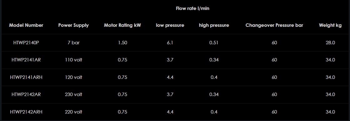 Čerpadlá pre hydraulické momentové kľúče Hi-Force HTWP sú kompatibilné na použitie so všetkými hydraulickými momentovými kľúčmi Hi-Force. Všetky modely majú maximálny pracovný tlak 700 barov, sú vybavené ľahko prístupným a nastaviteľným poistným ventilom na nastavenie krútiaceho momentu a sú dostupné ako vzduchom poháňané alebo elektricky poháňané čerpacie jednotky. Všetky čerpadlá sú dodávané s diaľkovým ovládaním, tlačidlovým ručným závesným ovládačom s 3 metrovým káblom ovládacieho vedenia. Hydraulické tlakomery s dvojitou stupnicou (0-700 bar/0-10 000 psi) naplnené glycerínom sú štandardne vybavené všetkými modelmi. Vzduchom poháňané verzie tiež obsahujú integrovaný inline filter, regulátor, mazací systém s manometrom vzduchu a chladiaci systém výfukového vzduchu.