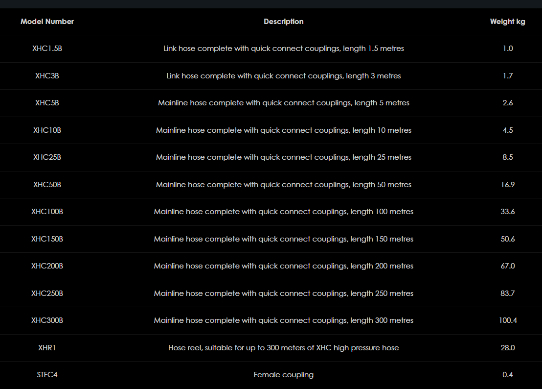 Hadicový navijak XHR1, ktorý je navrhnutý na pripojenie podmorskej hlavnej hadice medzi čerpadlom a prvým napínačom, je vhodný na použitie na mori a pojme až 300 metrov hydraulickej hadice Hi-Force XHC. Navijak je dodávaný s rýchlospojkami, integrovanou brzdou a pružinovou zaisťovacou skrutkou.