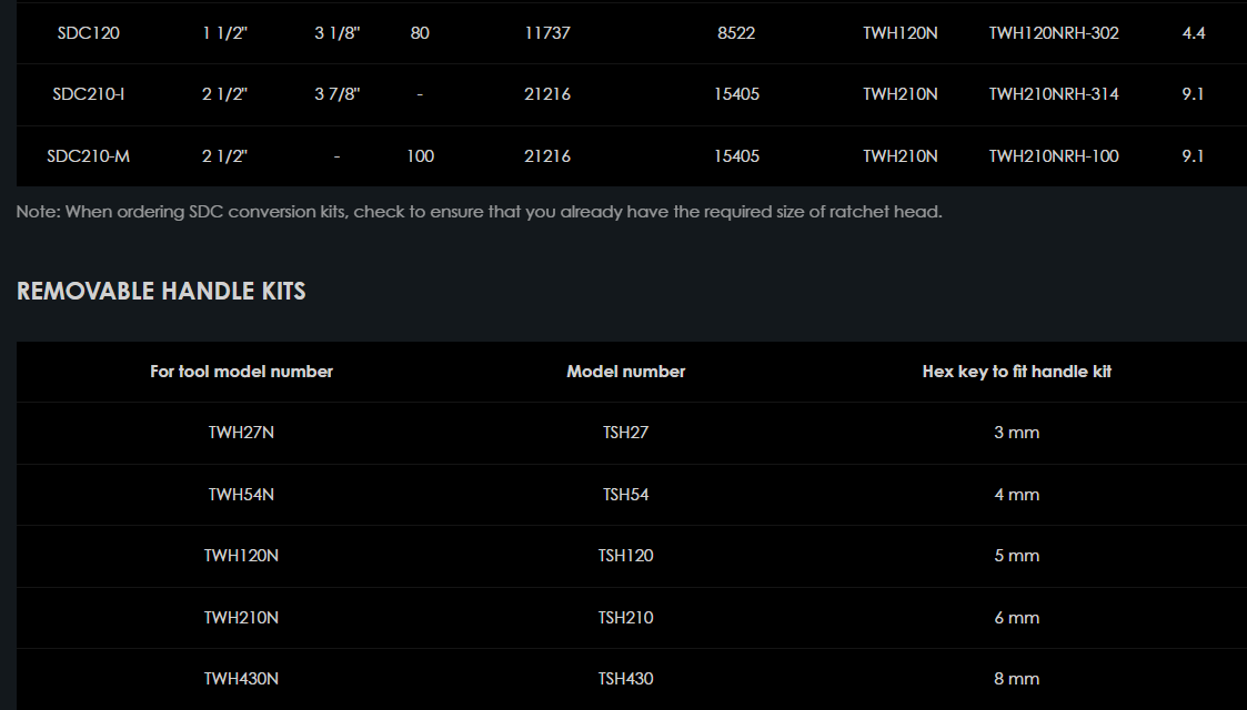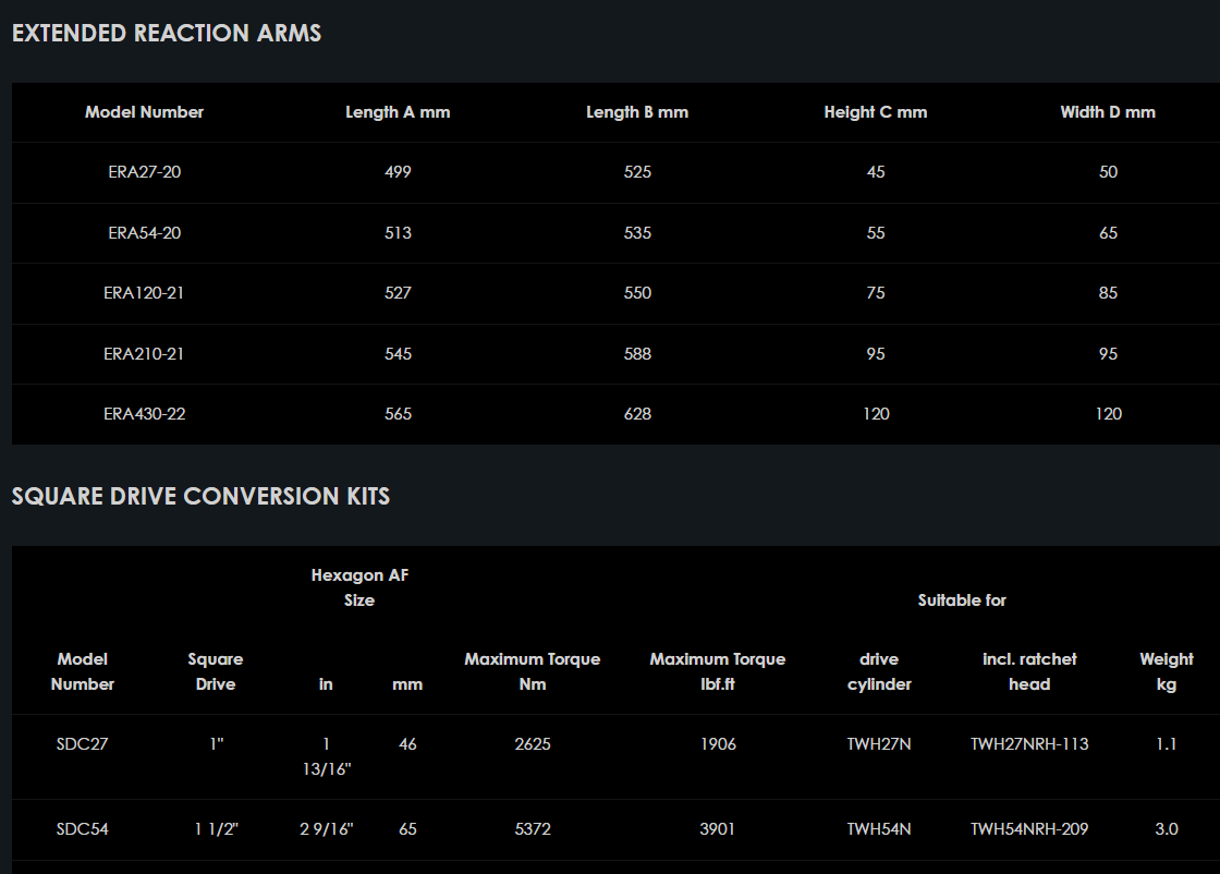 Pre všetky modely s výnimkou TWH430N sú k dispozícii konverzné súpravy Hi-Force SDC so štvorcovým pohonom, vhodné pre hydraulické momentové kľúče Hi-Force TWH-N so šesťhranným pohonom. Všetky modely sú dodávané kompletne s ľahko pripojiteľnou reakčnou pätkou a štandardným šesťhranným adaptérom veľkosti AF, ktorý je vhodný na montáž na bežne používanú veľkosť imperiálnej alebo metrickej račňovej hlavy podľa typu nástroja (ďalšie podrobnosti nájdete v tabuľke nižšie). Tieto súpravy SDC poskytujú najflexibilnejšiu a nákladovo najefektívnejšiu metódu premeny hydraulického momentového kľúča s vnútorným šesťhranom na kľúč so štvorcovým pohonom a sú k dispozícii vo veľkostiach štvorcového pohonu 1", 1 1/2" alebo 2 1/2".
