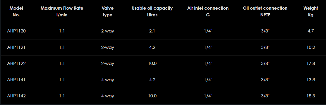Séria vzduchom poháňaných jednostupňových čerpadiel AHP11 ponúka ekonomickú a rýchlejšiu alternatívu k základným ručne ovládaným čerpadlám. Dostupné s 2-cestnými aj 4-cestnými ručne ovládanými regulačnými ventilmi Čerpadlá série AHP11 obsahujú ergonomicky navrhnutý pedál, ktorý operátorovi ponúka možnosť výberu ovládania rukou alebo nohou (okrem modelov so 4-cestnými ventilmi). Dostupné sú aj možnosti diaľkového vzduchom poháňaného závesného ovládania.