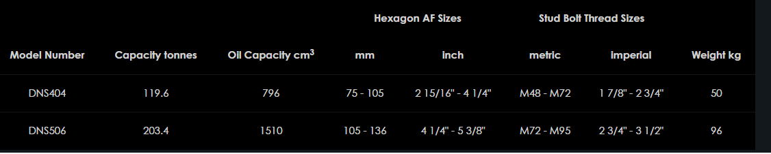 Rad Hi-Force DNS dvojčinných hydraulických štiepačiek na matice ponúka výber z 2 modelov vhodných na delenie matíc rôznych veľkostí (AF) od 75 mm do 136 mm (2,15/16" až 5,3/8"). Oba modely majú maximálny pracovný tlak 700 barov a sú vybavené dvojčinným hydraulickým piestom pre ľahké vysúvanie a zasúvanie štiepacieho noža z tvrdenej ocele. Hydraulické štiepačky matíc radu Hi-Force DNS sa ľahko nastavujú a sú schopné rýchlo a bezpečne štiepať matice bez iskier, plameňov alebo odletujúcich nečistôt, ktoré sú zvyčajne spojené s rezaním horákov.