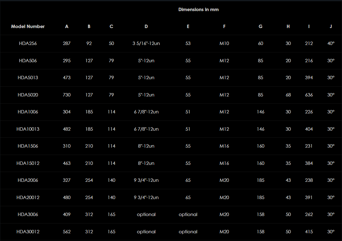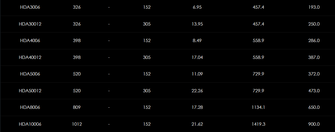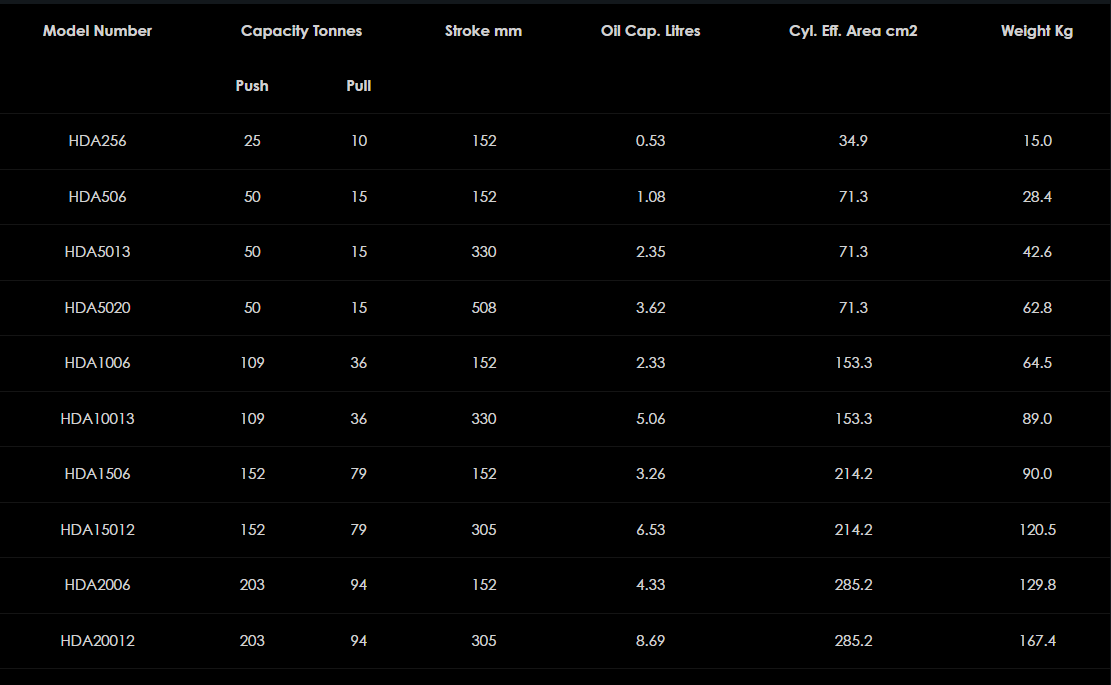 Rad dvojčinných valcov HDA ponúka maximálnu všestrannosť a odolnosť. Dvojčinný dizajn, špeciálne navrhnutý pre ťažké zdvíhanie, stavebné a údržbárske aplikácie, ako aj lisovanie a priemyselnú výrobu, poskytuje značnú ťažnú silu v režime zaťahovania piestu, ako aj rýchle a kontrolované zaťahovanie pre nepretržitú prevádzku v pracovnom cykle. Všetky modely do 203 ton sú štandardne dodávané s plochým sedlom, závitmi piestnej tyče a golierovými závitmi. Modely od 326 ton a vyššie sú dodávané bez golierového závitu a závitu piestnice, štandardne však obsahujú vymeniteľné naklápacie sedlo. Iné kapacity a dĺžky zdvihu sú k dispozícii na požiadanie.