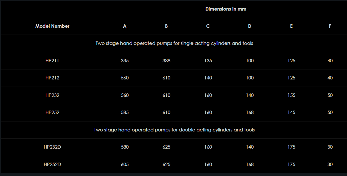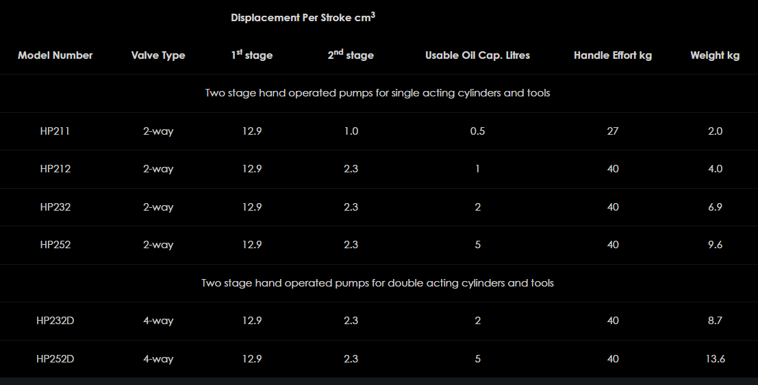 Rad ručne ovládaných hliníkových čerpadiel HP ponúka dvojrýchlostnú prevádzku a všetky modely sa dodávajú kompletne s vopred naplnenou olejovou nádržou, pripravenou na okamžité použitie. Všetky modely majú maximálny pracovný tlak 700 barov a sortiment zahŕňa modely čerpadiel vhodné na použitie s jednočinnými alebo dvojčinnými valcami a nástrojmi. Rad HP ponúka ideálne riešenie pre aplikácie, kde sa vyžaduje úplne nezávislá prenosná hydraulická sila. Vďaka nízkej námahe rukoväte pre jednoduchú obsluhu a ľahkému dizajnu majú všetky modely pevnú odolnú konštrukciu. Ručne ovládané čerpadlá Hi-Force HP majú osvedčené výsledky v celom odvetví a ponúkajú vynikajúcu hodnotu za peniaze v oblasti prenosnej hydraulickej sily.