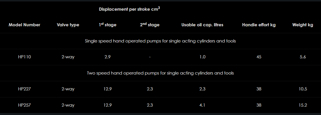 Rad ručne ovládaných čerpadiel HP ponúka výber jedno- alebo dvojrýchlostnej prevádzky a všetky modely sa dodávajú kompletne s vopred naplnenou olejovou nádržou, pripravenou na okamžité použitie. Všetky modely majú maximálny pracovný tlak 700 barov a sortiment zahŕňa modely čerpadiel vhodné na použitie buď s jednočinnými valcami alebo nástrojmi. Rad HP ponúka ideálne riešenie pre aplikácie, kde sa vyžaduje úplne nezávislá prenosná hydraulická sila. Vďaka nízkej námahe rukoväte pre jednoduchú obsluhu majú všetky modely pevnú odolnú konštrukciu. Ručne ovládané čerpadlá Hi-Force HP majú osvedčené výsledky v celom odvetví a ponúkajú vynikajúcu hodnotu za peniaze v oblasti prenosnej hydraulickej sily. K dispozícii je celý rad komponentov systému vhodných na použitie s ručne ovládanými čerpadlami HP.