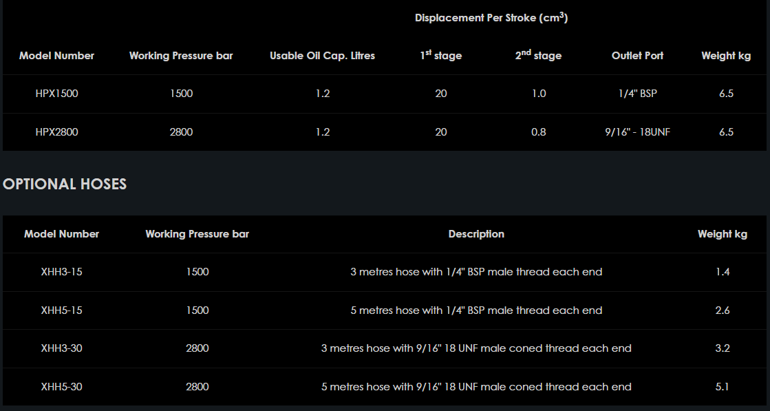 Rad ručne ovládaných ultra vysokotlakových hydraulických čerpadiel HPX je špeciálne navrhnutý pre vysokotlakové aplikácie, ako je vstrekovanie oleja na odstraňovanie puzdier, testovanie ventilov, kalibrácia vysokotlakových zariadení a nástrojov, laboratórne roztrhnutie a testovanie odolnosti atď. Dvojrýchlostná prevádzka na HPX1500 aj HPX2800 zahŕňa automatické prepínanie z nízkeho na vysoký tlak pri 20 baroch, čo umožňuje hladké a nízke úsilie operátora. Oba modely sú vybavené čítacou lištou s dvojitou stupnicou a psi, ktoré sú súčasťou rukoväte so slučkou na mieru a sú vybavené sieťovým puzdrom, ktoré chráni meradlo pred náhodným poškodením.