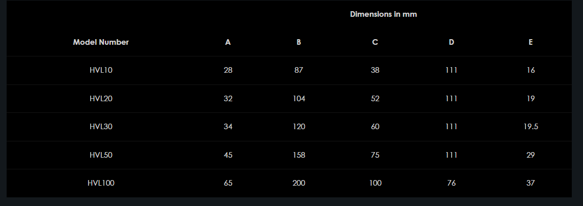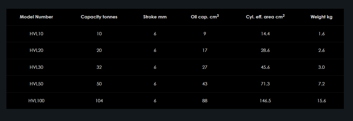 Rad valcov HVL typu "palacinka" kombinuje veľmi nízku zatvorenú výšku so zdvihom 6 mm, čo poskytuje presnú nastavovaciu a zdvíhaciu silu vo veľmi stiesnených pracovných priestoroch. Ideálne sa hodí pre aplikácie vyžadujúce vyrovnanie strojov, turbín, ťažkých konštrukcií atď. Všetky modely sú jednočinné s vratnou silou. Základňa všetkých valcov HVL musí byť počas používania plne podopretá.