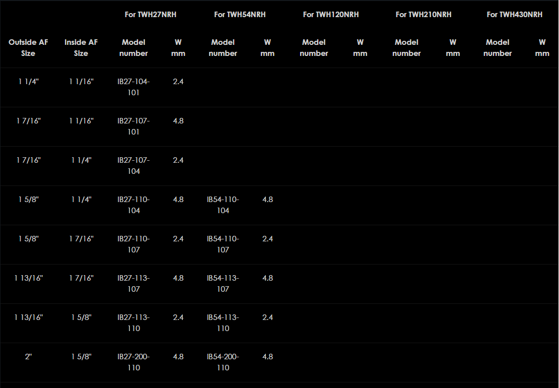 Na zmenšenie veľkosti samičieho šesťhranu AF imperiálnych račňových hláv TWH-NRH ponúkajú tieto šesťhranné redukčné puzdrá Hi-Force jednoduché a ekonomické riešenie. Stačí si vybrať vonkajšiu veľkosť AF (t. j. veľkosť AF s račňou) a požadovanú vnútornú veľkosť AF na určenie čísla modelu. Upozorňujeme, že hrúbka steny (uvedená nižšie ako rozmer "W") musí byť pripočítaná k minimálnemu rozmeru polomeru vašej hlavy račne pri použití puzdra redukcie.