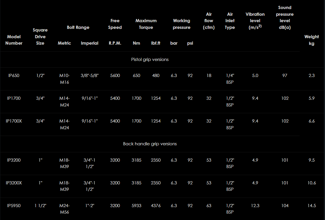 Rad vysokovýkonných pneumatických rázových uťahovákov IP je navrhnutý pre veľkoobjemovú výrobu, náročnú údržbu a stavebné práce. S výberom zo štyroch modelov so štvorcovými veľkosťami pohonu od ½" do 1½" ponúkajú IP rázové uťahováky tichú prevádzku s nízkou úrovňou vibrácií a zvýšeným krútiacim momentom až do 5933 Nm.