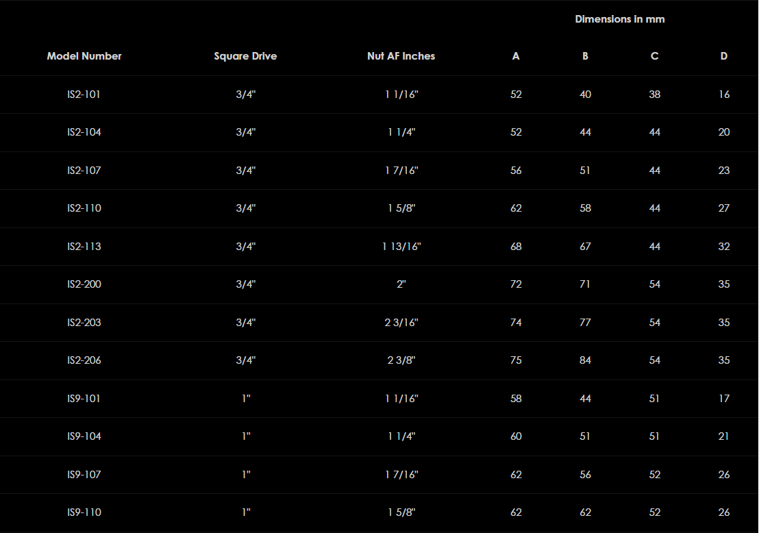 Vysokokvalitné vysokovýkonné nástrčky Hi-Force imperial sú navrhnuté a vyrobené na použitie so všetkými skrutkovacími produktmi Hi-Force, vrátane hydraulických momentových kľúčov a rázových uťahovákov. Sortiment imperiálnych rázových nástrčných kľúčov IS ponúka 47 modelov so štvorcovými pohonmi od ¾" do 2 ½" a naprieč plochými veľkosťami až do 6⅞." Dlhé, bi-šesťhranné a špeciálne nástrčné násady sú k dispozícii na požiadanie.
