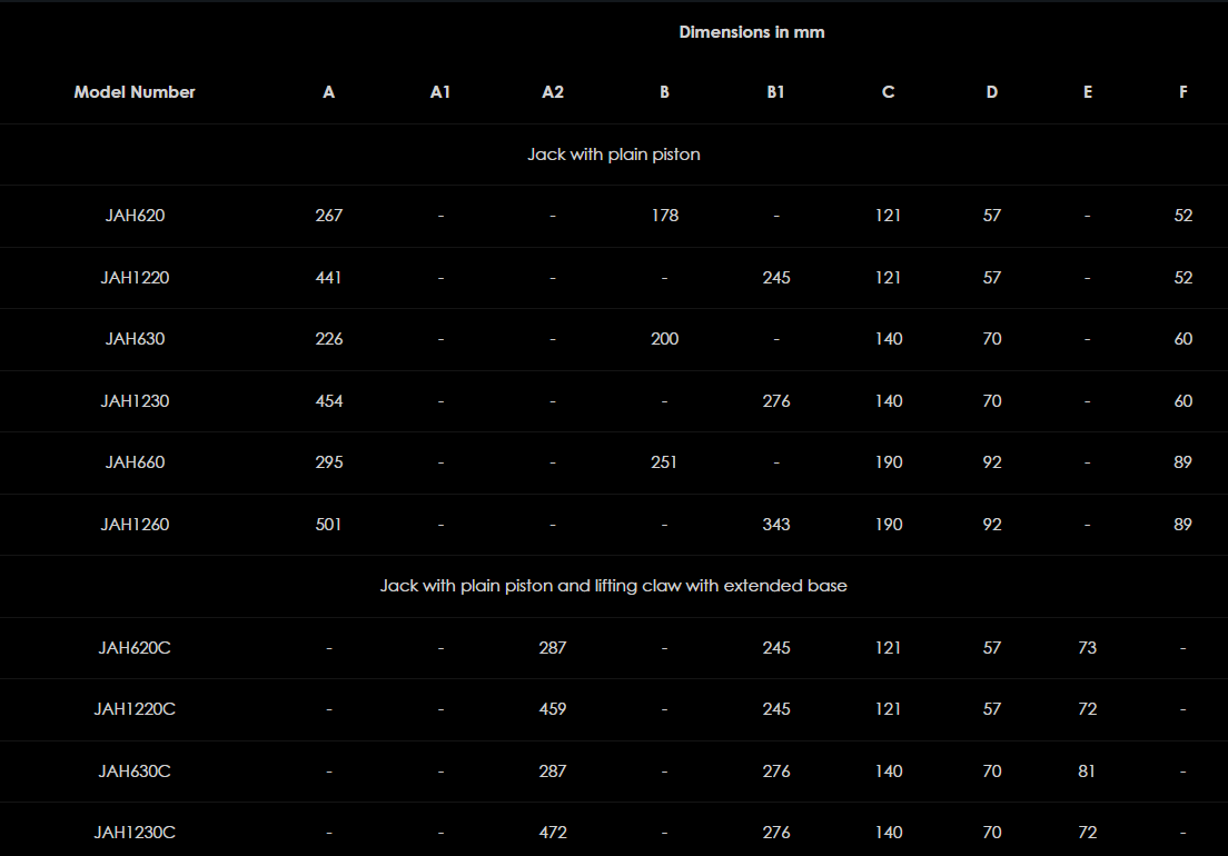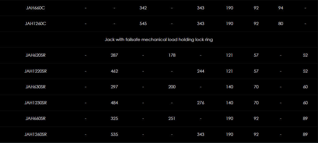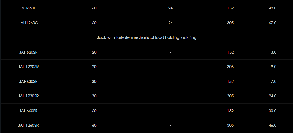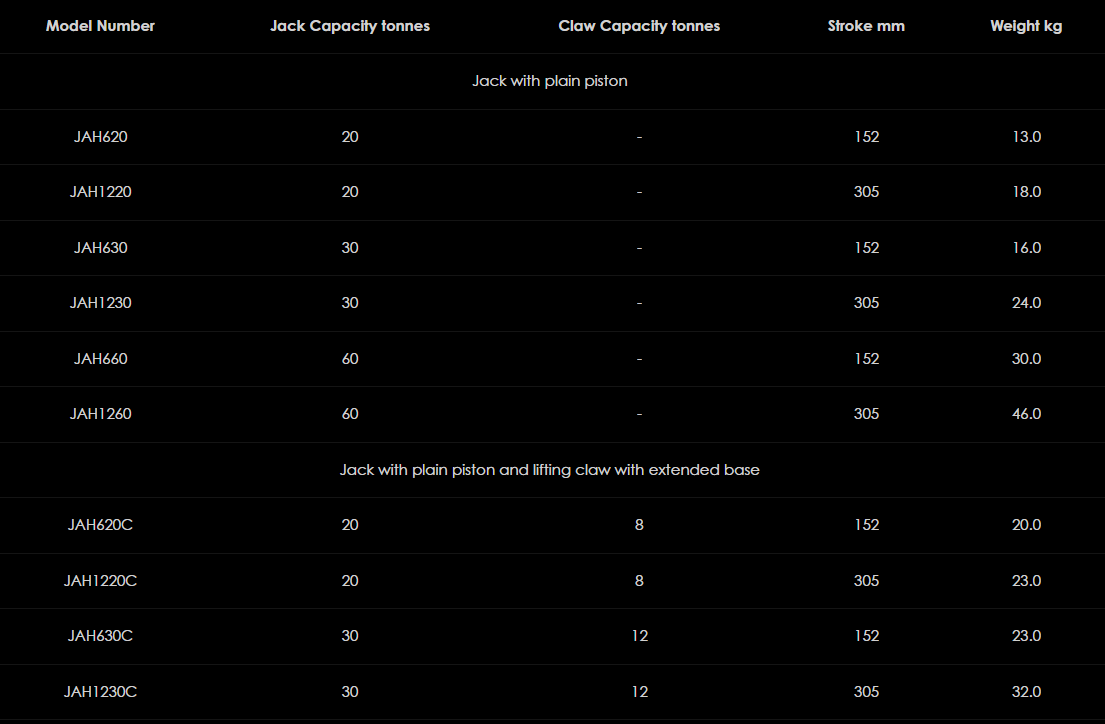 Rad ľahkých hliníkových zdvihákov JAH ponúka širokú škálu kapacít a možností výšky zdvihu. Všetky modely sú k dispozícii buď ako obyčajné zdviháky s alebo bez "bezpečného" mechanického uzamykacieho krúžku, alebo voliteľný dizajn zdvíhania s nízkou výškou. Všetky modely sú konštruované prevažne z ľahkej hliníkovej zliatiny so všetkými dôležitými funkčnými časťami vyrobenými z vysoko kvalitnej ocele. Tieto vysokokvalitné zdviháky, ktoré sa vo veľkej miere používajú pri údržbe, stavebníctve, ťažkých strojoch a strojoch, sú osvedčeným priemyselným štandardom.