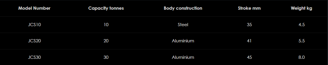 Rad kompaktných zdvihákov Hi-Force JCS je ideálne vhodný pre aplikácie vyžadujúce zdvíhaciu alebo polohovaciu silu v stiesnených priestoroch. Ľahké, ľahko ovládateľné a vyrobené z prvotriednej ocele (JCS10) a hliníka (JCS20 a JCS30), všetky modely obsahujú piest s pružinou asistovaným spätným chodom, potiahnutý opotrebením. Čerpací mechanizmus sa otáča o 360° a poskytuje maximálnu všestrannosť v akejkoľvek aplikácii. Vďaka odnímateľnej ovládacej rukoväti s dĺžkou iba 240 mm sa tieto kompaktné zdviháky zmestia do každej skrinky na náradie.