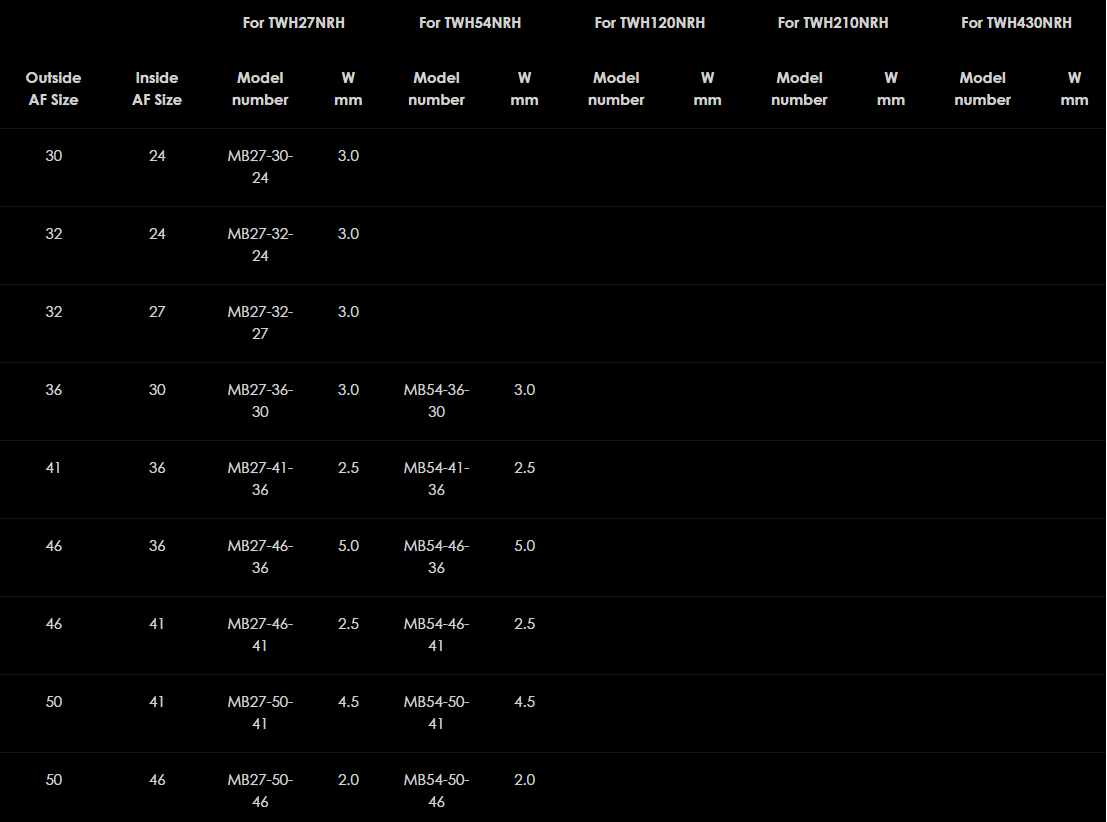 Na zmenšenie veľkosti samičieho šesťhranu AF metrických račňových hláv TWH-NRH ponúkajú tieto šesťhranné redukčné puzdrá Hi-Force jednoduché a ekonomické riešenie. Stačí si vybrať vonkajšiu veľkosť AF (t. j. veľkosť AF s račňou) a požadovanú vnútornú veľkosť AF na určenie čísla modelu. Upozorňujeme, že hrúbka steny (uvedená nižšie ako rozmer "W") musí byť pripočítaná k minimálnemu rozmeru polomeru vašej hlavy račne pri použití puzdra redukcie.
