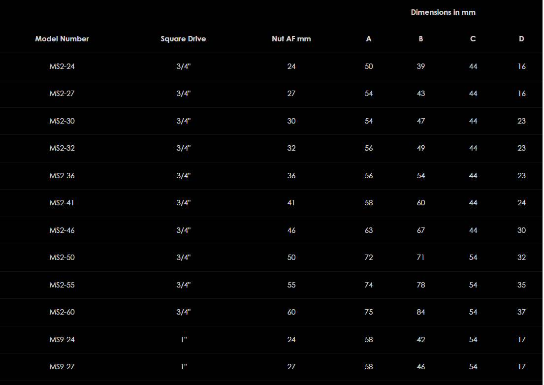 Vysokokvalitné vysokovýkonné hlavice metrických rozmerov Hi-Force sú navrhnuté a vyrobené na použitie so všetkými skrutkovacími produktmi Hi-Force, vrátane hydraulických momentových kľúčov a rázových kľúčov. Rad metrických rázových nadstavcov MS ponúka 56 modelov so štvorhranmi od ¾" do 2 ½" a naprieč plochými veľkosťami až do 145 mm. Dlhé, bi-šesťhranné a špeciálne objímky sú k dispozícii na požiadanie.