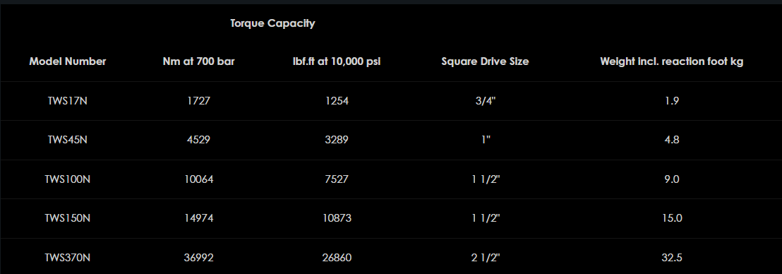 ahké hliníkové hydraulické momentové kľúče Hi-Force série TWS-N sú navrhnuté tak, aby presne a rýchlo zvládli aj tie najnáročnejšie skrutkovacie práce. Všetky modely poskytujú presnosť krútiaceho momentu +/- 3 %. Vnútorné drážkovanie reakčného ramena umožňuje operátorovi jednoducho umiestniť nástroj a v prípade potreby reagovať priamo z tela nástroja v aplikáciách s veľmi obmedzeným prístupom. Všetky modely obsahujú ľahko reverzibilný štvorhranný pohon z vysoko kvalitnej legovanej ocele, ktorý umožňuje operátorovi rýchlo prejsť z uťahovania na povoľovanie.