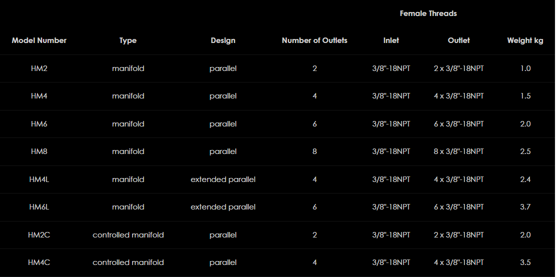 Hi-Force rozdeľovače sú špeciálne navrhnuté tak, aby umožňovali jednoduché ovládanie smeru toku hydraulickej kvapaliny v systéme. Rozdeľovače Hi-Force, dodávané buď ako otvorené bloky rozdeľovača alebo s individuálnymi uzatváracími/škrtiacimi ventilmi typu ihly na každom 3/8" NPT výstupe, poskytujú ešte väčšiu všestrannosť vo vašom hydraulickom systéme. Rad ponúka 8 modelov s možnosťou výberu až 8 výstupov na rozdeľovač a všetky modely sú vhodné pre maximálny pracovný tlak 700 barov.