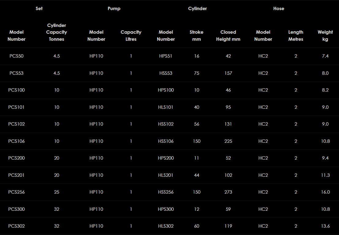 Súpravy čerpadiel a valcov Hi-Force PCS poskytujú najjednoduchší a cenovo najefektívnejší spôsob, ako okamžite začať pracovať. Všetky súpravy sa skladajú z hydraulického valca Hi-Force (dostupný široký výber), vhodnej ručnej pumpy Hi-Force a dvojmetrovej hadice s rýchlospojkou s vysokým prietokom.