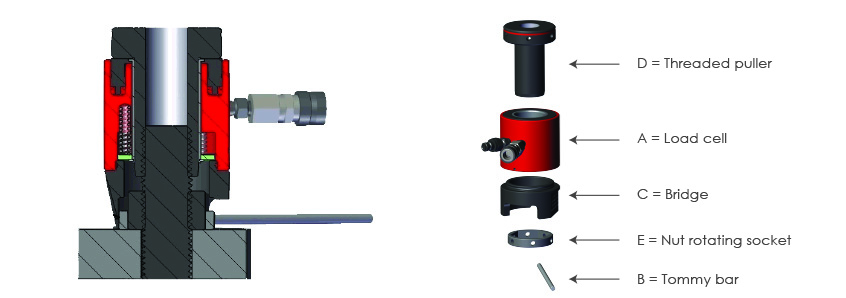 Modely napínačov SBT3, SBT4 a SBT6 sú dostupné s dvoma rôznymi veľkosťami mostíka, preto vždy skontrolujte, či je požadovaná výmena závitu možná v rámci veľkosti mostíka. NEMIEŠAJTE komponenty a uistite sa, že sa všetky komponenty zhodujú. Veľký mostík bude vyžadovať použitie dlhého sťahováka so závitom na zaistenie dostatočného záberu závitu, ako aj veľkú otočnú objímku matice.