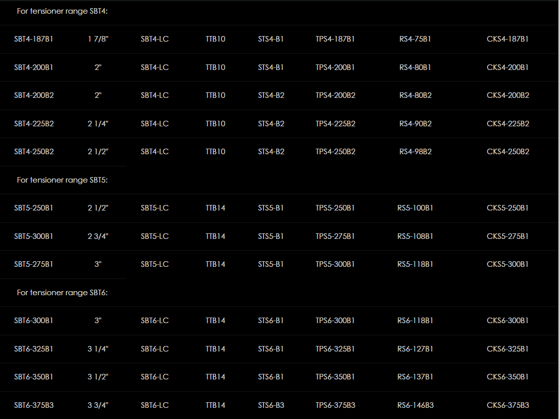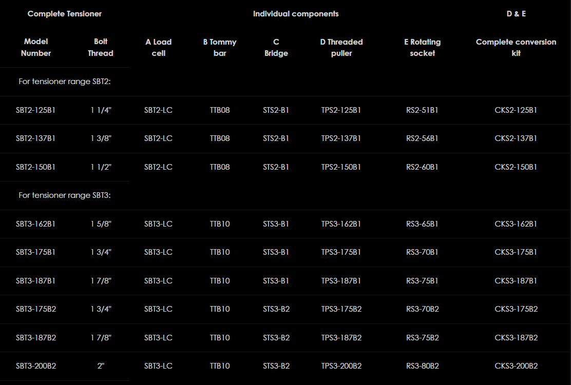 Nižšie uvedená tabuľka poskytuje všetky informácie na výber komponentov, vrátane adaptéra s krátkym závitom, snímača zaťaženia, malého mostíka, malej matice s otočným nástavcom a tyče, na úpravu vášho existujúceho napínača tak, aby vyhovoval inej veľkosti skrutiek. Zmeny sú možné len v rámci rovnakej veľkosti napínača. Je nevyhnutné, aby všetky komponenty alebo vybrané konverzné súpravy mali rovnakú príponu ako cieľová veľkosť napínača (t.j. B1, B2 alebo B3).
