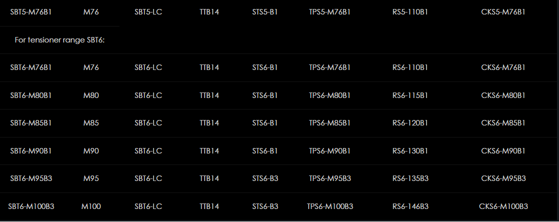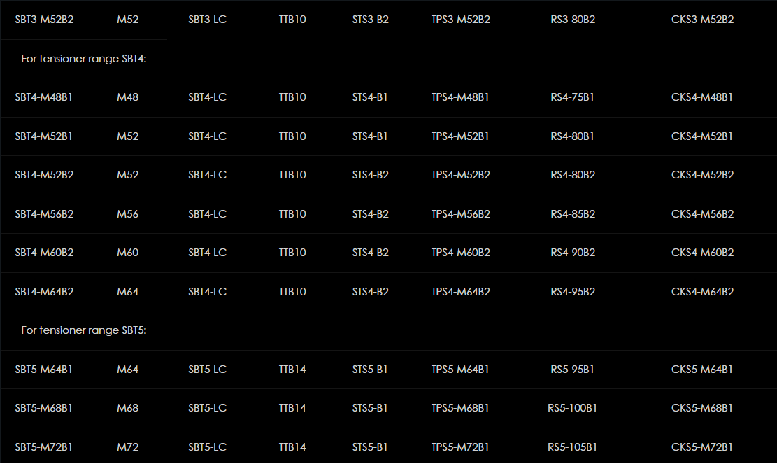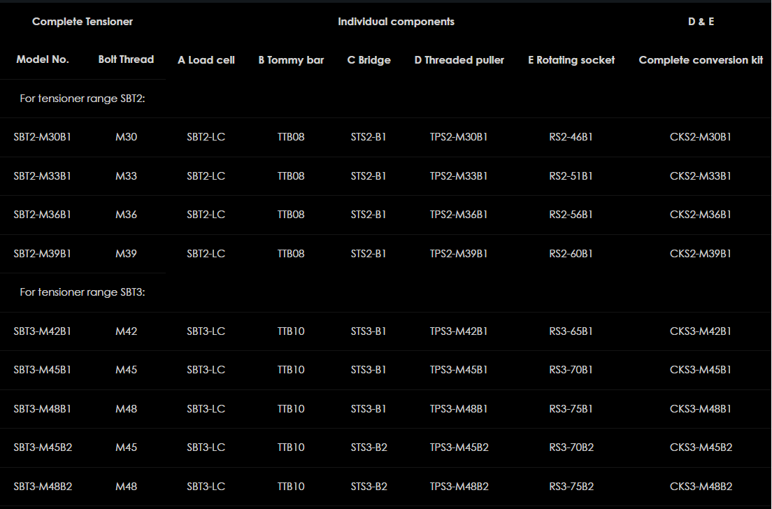 Nižšie uvedená tabuľka poskytuje všetky informácie na výber komponentov, vrátane adaptéra s krátkym závitom, snímača zaťaženia, malého mostíka, malej matice s otočným nástavcom a tyče, na úpravu vášho existujúceho napínača tak, aby vyhovoval inej veľkosti skrutiek. Zmeny sú možné len v rámci rovnakej veľkosti napínača. Je nevyhnutné, aby všetky komponenty alebo vybrané konverzné súpravy mali rovnakú príponu ako cieľová veľkosť napínača (t.j. B1, B2 alebo B3).
