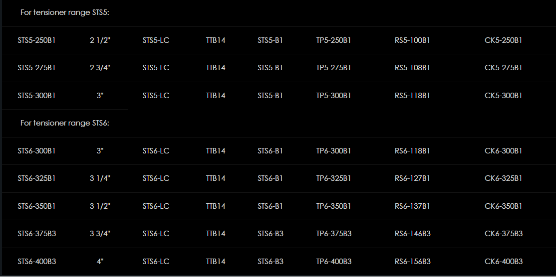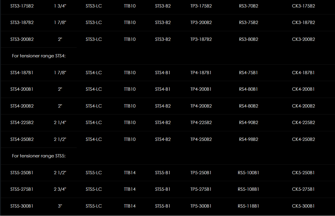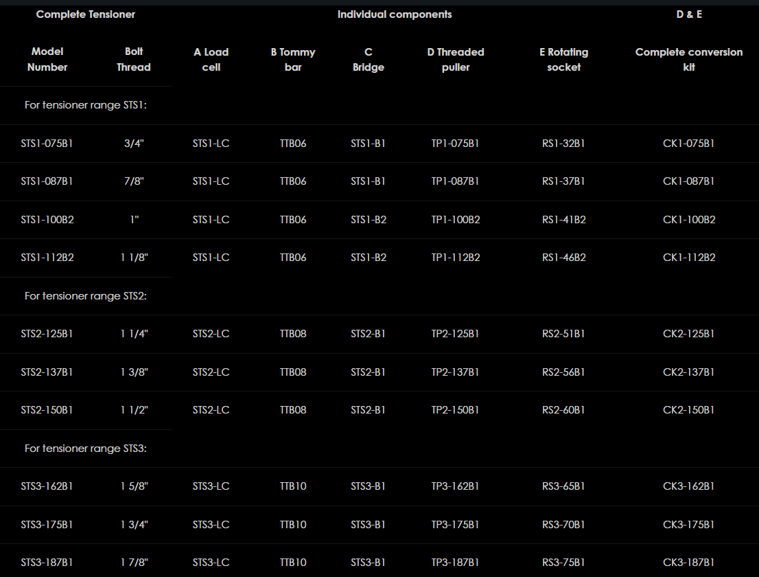 Nižšie uvedená tabuľka poskytuje všetky informácie na výber komponentov, vrátane adaptéra s krátkym závitom, snímača zaťaženia, malého mostíka, malej matice s otočným nástavcom a tyče, na úpravu vášho existujúceho napínača tak, aby vyhovoval inej veľkosti skrutiek. Zmeny sú možné len v rámci rovnakej veľkosti napínača. Je nevyhnutné, aby všetky komponenty alebo vybrané konverzné súpravy mali rovnakú príponu ako cieľová veľkosť napínača (t.j. B1, B2 alebo B3).