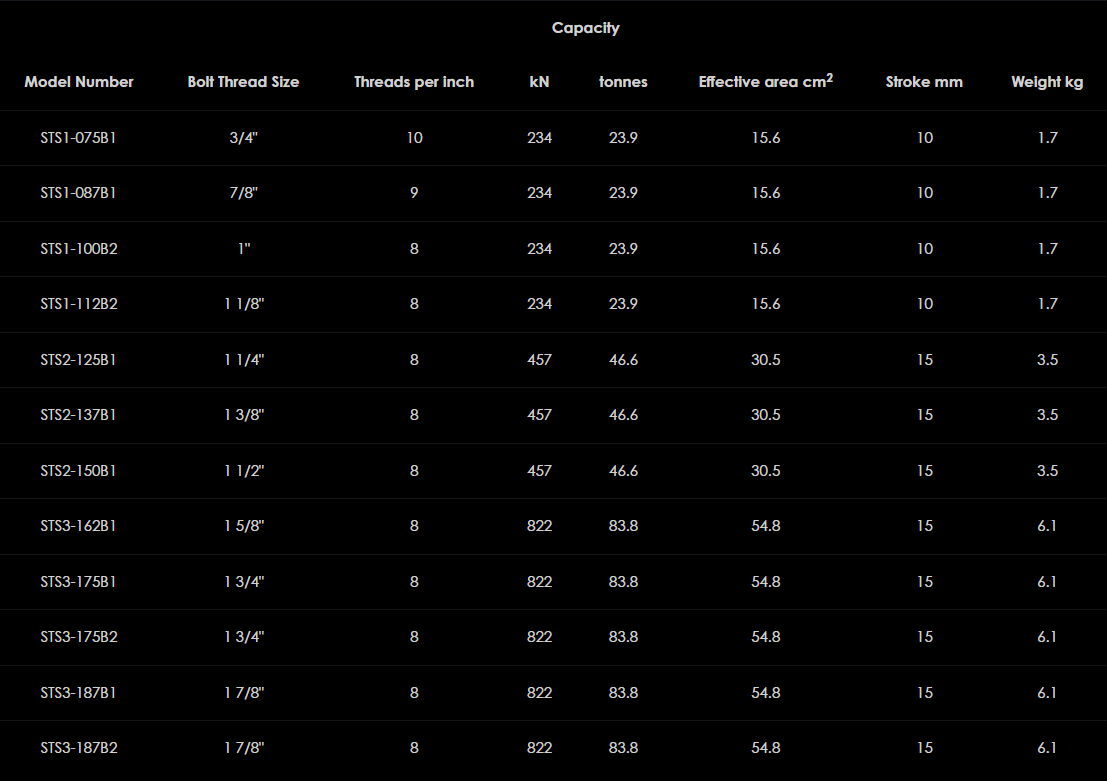 Rad imperiálnych napínačov skrutiek STS je navrhnutý pre prevádzku na hornej strane v širokej škále aplikácií vrátane potrubných prírub, výmenníkov tepla, tlakových nádob, krytov kompresorov, napájacích čerpadiel kotlov, kotevných skrutiek a mnohých ďalších. Sortiment zahŕňa 26 možností imperial veľkosti v rozsahu od ¾" do 4" veľkosti závitu a všetky modely sú vhodné pre pracovné tlaky do 1500 barov. Každý model hydraulického napínacieho valca v rámci radu napínačov môže byť ovládaný rôznymi závitovými sťahovákmi a maticovými otočnými objímkami, ktoré zaisťujú, že je možné prispôsobiť sa maximálnemu možnému rozsahu veľkostí skrutiek s použitím minimálneho počtu hydraulických valcov. Sťahováky závitov, mostíky a otočné objímky matíc sú k dispozícii ako samostatné komponenty
