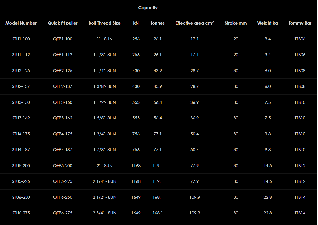 Podmorské napínače skrutiek série Hi-Force STU sú navrhnuté a vyrobené tak, aby vyhovovali náročným požiadavkám potápačov pracujúcich v drsnom podmorskom prostredí. Vďaka jednoducho ovládateľnej dvojdielnej konštrukcii pozostávajúcej z rýchloupínacieho/uvoľňovacieho závitového sťahováka a hydraulického silomeru s integrálnym mostíkom a extra dlhým 30 mm zdvihom piesta na zníženie operácií opätovného nastavenia ponúkajú podmorské napínače skrutiek Hi-Force série STU konzistentnú, spoľahlivú a nákladovo efektívnu metódu napínania podmorských skrutkových spojov. Všetky hydraulické snímače zaťaženia sú vhodné pre rôzne veľkosti závitov a vymeniteľné rýchloupínacie/uvoľňovacie sťahováky je možné podľa potreby objednať samostatne, výsledkom čoho je ešte väčšia flexibilita a úspora nákladov.
